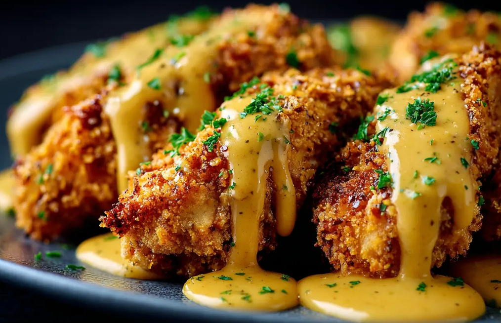 Pretzel Crusted Chicken with Mustard Cheddar Sauce